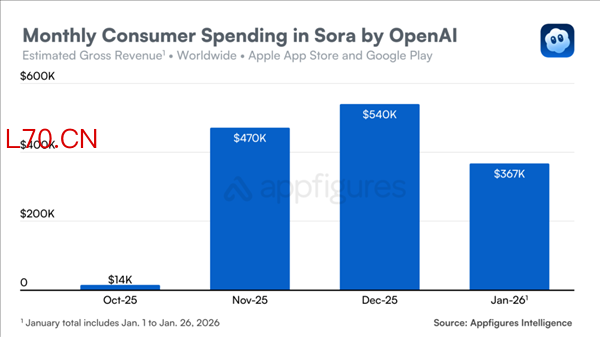 Appfigures数据显示,Sora App的用户付费已经从去年12月的54万美元,跌到今年1月的36.7万美元。