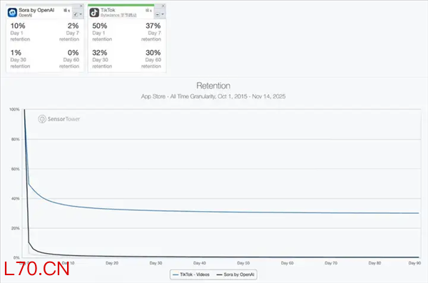 在 Sora 2 上线两个月的时间里,用户留存率经历了断崖式下降,次日留存 10%,第 7 天跌到 2%,到了第 30 天,这个数字已经变成了 1%,第 60 天近乎于无。