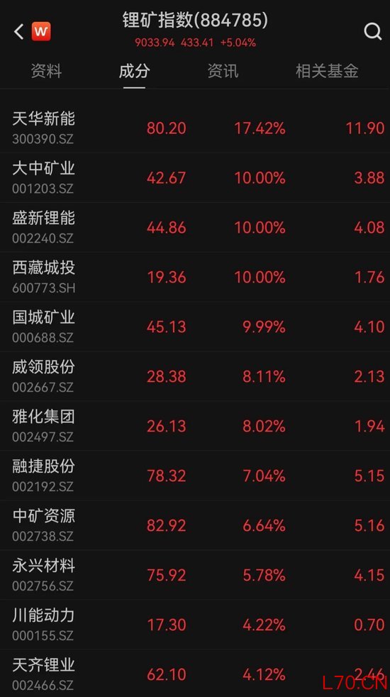 4月13日,锂矿板块震荡走高,盛新锂能、大中矿业等多股收盘涨停,天华新能涨17.42%。