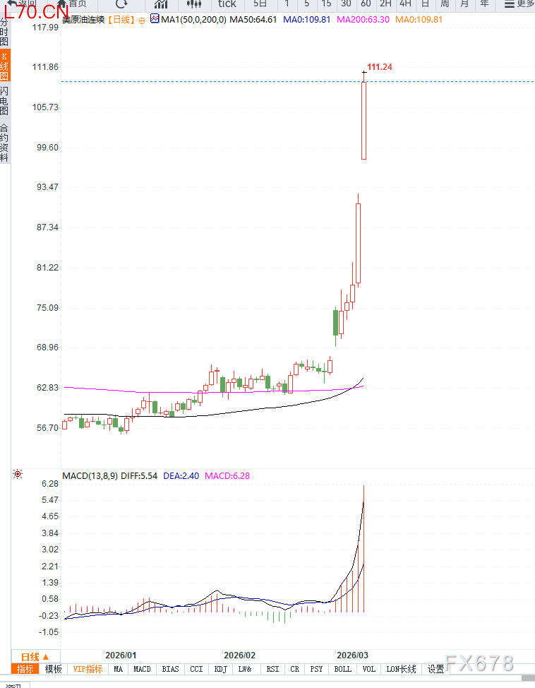 技术结构显示:RSI明显进入超买区K线远离短期均线波动率大幅扩大这种走势通常意味着市场情绪极度紧张,短线可能出现:技术性回调高位震荡整理如果价格回落至105美元附近并获得支撑,油价仍可能重新测试111美元甚至115美元。