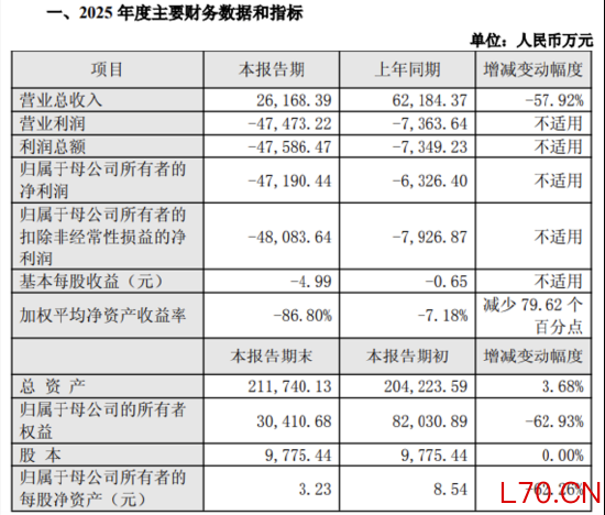 监管处分落地当日,公司同步披露2025年业绩快报。数据显示,2025年实现营业收入2.62亿元,同比下降57.92%;实现归母净利润-4.72亿元,相较上年同期-6326.4万元,亏损同比扩大约650%。截至2025年末,公司总资产21.17亿元,较年初增长3.68%;归属于母公司的所有者权益3.04亿元,较年初下降62.93%。