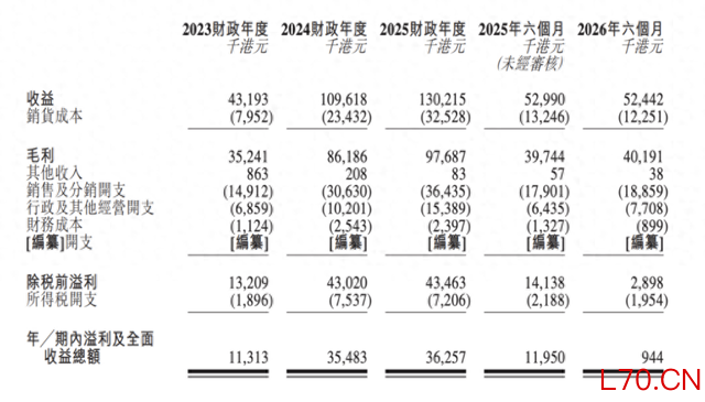 2023财年、2024财年、2025财年(财政年结日为3月31日),公司分别实现营业收入4319.3万港元、1.09亿港元、1.3亿港元,三年营收复合年增长率高达73.6%;同期实现净利润分别为1131.3万港元、3548.3万港元、3625.7万港元。