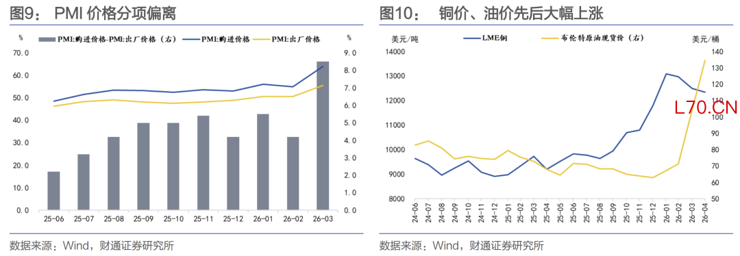 原油大涨带动原材料购进价格。PMI价格分项,3月出厂价格指数升至55.4%,主要原材料购进价格指数升至63.9%,两者偏离再度走扩,下游行业利润进一步承压。高频方面,3月原油均价上涨45.84%,影响PPI环比上行1.38个百分点。