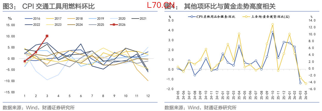 3月沪金均价转跌,对核心CPI形成拖累。自2025年9月份起,其他用品和服务环比持续大幅高于季节性,对核心CPI环比明显支撑。其他用品和服务项中变化最大的就是黄金首饰价格。按照2025年4月统计局解读中“国内金饰品价格上涨10.1%,影响CPI环比上涨约0.06个百分点”估算,3月金饰品环比下跌3.9%,影响CPI和核心CPI环比分别下降约0.23、0.33个百分点。
