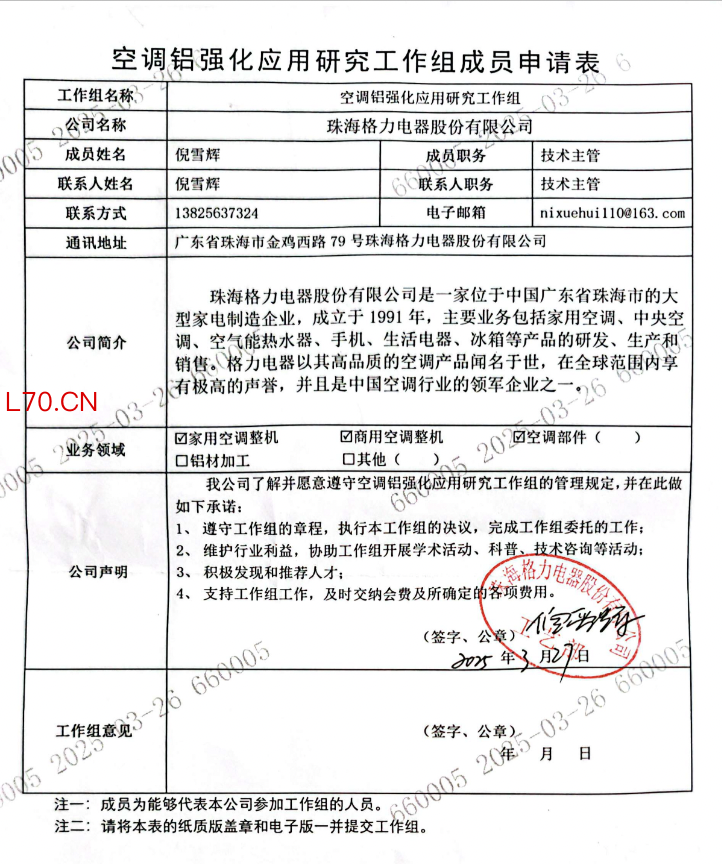 但据界面新闻获得的一份《空调铝强化应用研究工作组成员申请表》显示,去年3月27日,格力曾主动申请加入“铝代铜”工作组。
