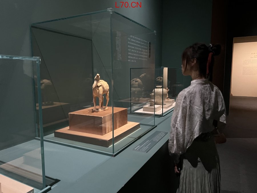 展览中的诸多文物,更将隋代的繁华与开放展现得淋漓尽致。李静训曾祖父李贤墓出土的鎏金银壶,本是波斯酒具,壶身上却描绘着古希腊神话故事,壶把上的深目高鼻人像,见证着丝路之上的文明交融;2023年陕西出土的骆驼俑,驮袋上刻画的希腊酒神狄俄尼索斯醉态可掬,印证了隋代对外文化交流的深度与广度;墓中出土的17件青瓷、白瓷,则记录着北方白瓷走向成熟的关键阶段,为唐五代“南青北白”的瓷业格局奠定了基础。