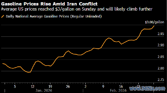 周一,随着载有原油和燃料的油轮几乎停止通行霍尔木兹海峡,汽油期货一度上涨9%。美国汽车协会的数据显示,周日美国汽油零售均价升至每加仑3美元,为三个月来最高水平。