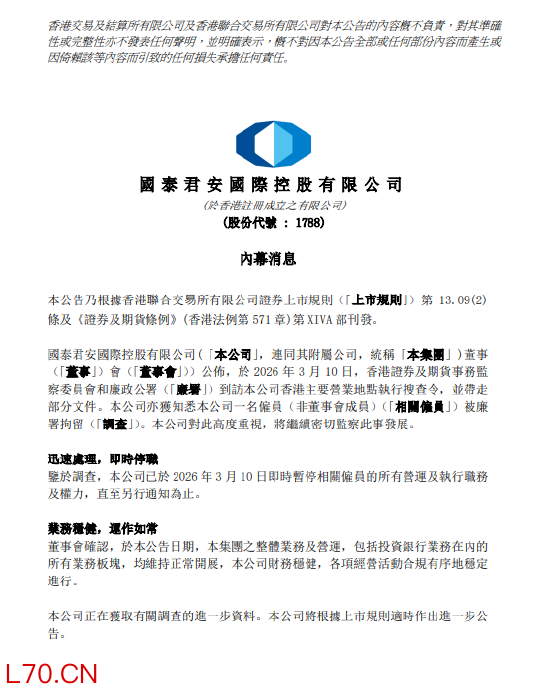 一名员工被香港廉政公署拘留!国泰君安国际:公司业务运营正常
