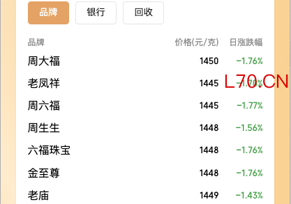 4月9日,品牌金价格整体小幅下跌约1.7%,周大福、老凤祥、周生生等黄金克价均跌至1450元及以下,水贝金饰价跌至1200元附近,银行投资金条克价跌至1060元左右。