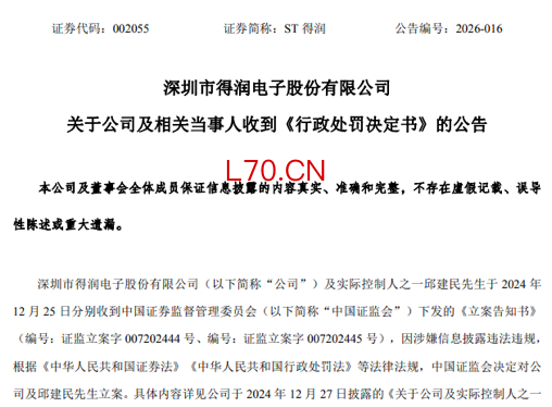 配资网站ST得润(原“得润电子”)公告显示,3月27日,公司及相关当事人收到深圳证监局出具的《行政处罚决定书》。